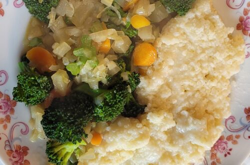 vaříme 2 recepty: oliv. olej, him. sůl, cibule a česnek, (nebo cibule a zázvor), dýně Hokaido, červenou čočku, přidáváme mořskou řasu kvůli minerálům, někdy bob. list a kurkumu, vodu (vývar) a ke konci vaření přidat na chvíli jemné oves. vločky, nebo k polévce celozrnnou, BIO domácí špaldovou housku, nebo BIO domácí žitný dalamánek… Nakonec rozmixovat tyč. mixérem. Polévku máme jako hlavní syté jídlo. Hotovou polévku posypat tmavě zelenými, předem namočenými, nebo opraženými dýň. semínky, svátečně lze ozdobit dýň. olejem, nebo přidat rostl. kokosovou smetanou (z drogerie DM). A k tomu samozřejmě cokoliv čerstvého zeleného: pažitku, rukolu, polníček, pampelišky, koriandr, bazalku, pak-choi, špenát, libeček, chudobky, popenec, ptačinec, ml. mangold, listy od č. řepy, mrkvovou nať aj. A kopřivové semínko…